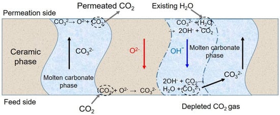 The presence of sulfur-containing gas consistently exerts a detrimental impact on the performance of the dual-phase membrane. However, certain impurities may facilitate the CO2 permeation process in the carbonate dual-phase membrane. For instance, H2O is a prevalent component in the product stream throughout the post- and pre-combustion processes. The process of steam dissolution in molten carbonates has long been acknowledged [63]. Xing et al. [64] synthesized CeO2–carbonate dual-phase membranes, employing a series of theoretical treatments to examine the influence of steam on CO2 transport. The findings demonstrated that the dissolution of steam in the form of hydroxide ions into molten carbonates could facilitate the diffusion of CO2. The CO2 flux of the CeO2–carbonate membrane demonstrates an approximate 30% increment when 2.5% H2O is introduced to the feed side, whereas a remarkable 250–300% increase in the CO2 flux is observed when the same amount of H2O is added to the permeation side [64]. The significant escalation in CO2 flux observed upon the introduction of steam can be attributed to the emergence of an additional pathway facilitating CO2 transport, as illustrated in Figure 6. The transport of OH− and CO32− ions in the molten carbonate phase occurs in opposite directions, whereas the direction of the OH− ions is consistent with that of the O2− ions from the ceramic phase. In the event that the OH− transport is integrated with O2− within the solid matrix, it would lead to an enhanced electrochemical gradient of the rate-limiting step, thereby facilitating the CO2 flux. The aforementioned research serves as a compelling illustration of enhancing the carbonate phase to facilitate CO2 permeation.