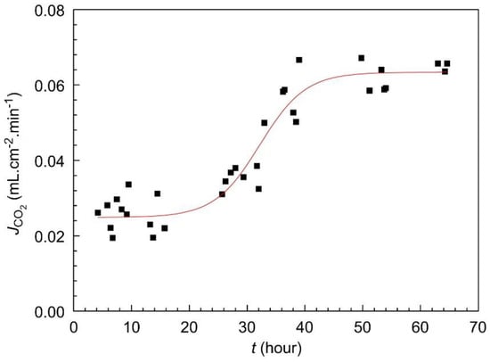Time dependence of CO2 flux through the BYS–carbonate dual-phase membrane at 650 °C (reprinted from [44] with permission of Elsevier).