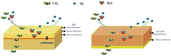 The selection of appropriate ceramic materials can enhance the stability of the carbonate dual-phase membrane; however, nearly all ceramic membranes are susceptible to varying degrees of sulfur-containing gas-induced degradation. In particular, the presence of H2S significantly impacts the ceramic material during the pre-combustion process in the presence of H2. Recently, Chen et al. [68] developed an asymmetric membrane, primarily composed of an adsorbed layer (SDC/BYS or SDC porous layer) for H2S removal and a dense ceramic–carbonate layer (SDC–carbonate dense layer) for CO2 separation, as illustrated in Figure 9. The function of BYS is to prevent the infiltration of molten carbonate into the pores of the adsorbed layer, owing to its non-wettability toward carbonates. The findings revealed that the utilization of asymmetric membranes significantly enhances the stabilization period of membrane separation (ranging from 10 to 12 times the stability duration of a single SDC–carbonate membrane). As illustrated in Figure 10a, the asymmetric membranes exhibit stable performance within a H2S-containing atmosphere, contrasting the instability of single-layer membranes. The development of a “saturation adsorption point” for H2S removal was observed in the asymmetric membrane during the CO2 separation process, leading to a decline in the performance of CO2 separation beyond this point. However, the adsorbed layer can be efficiently regenerated within a short duration at 850 °C in an oxygen-enriched gas stream [68] (refer to Figure 10b). The stripped sulfur from the adsorbed layer during the regeneration process can be collected as an elemental sulfur product, enhancing the efficiency and value of this membrane for CO2 capture in the pre-combustion IGCC application.