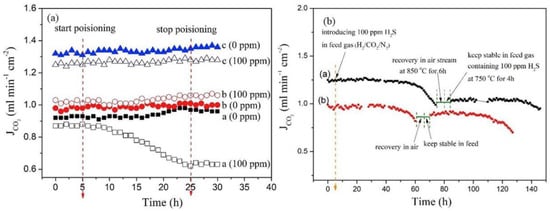 CO2 permeation stability of membranes with H2/CO2/N2 mixture feed containing 0 or 100 ppm H2S at 750 °C: (a) comparison of three different membranes (curve-a is single SDC–carbonate membrane; curve-b is SDC(porous)–BYS–SDC/carbonate membrane; curve-c is SDC/BYS(porous)–SDC/carbonate membrane), (b) Sulfur-resistant stability and regeneration capacity of the asymmetric membranes (curve-a is SDC(porous)–BYS–SDC/carbonate membrane; curve-b is SDC/BYS(porous)–SDC/carbonate membrane) (reprinted from [68] with permission of Elsevier).