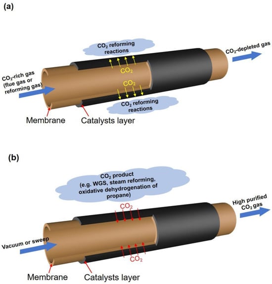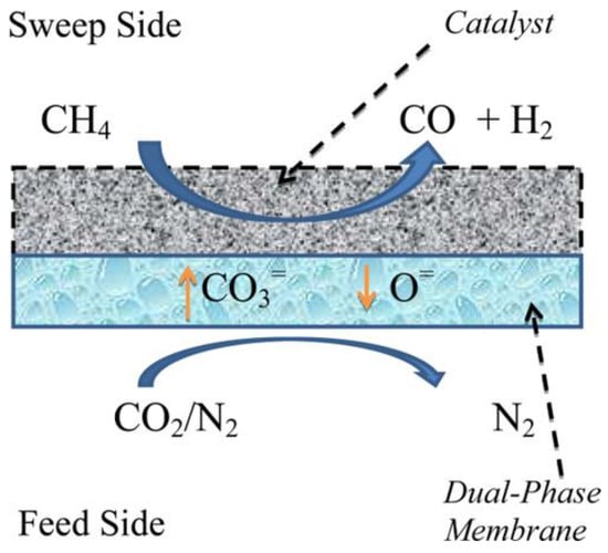 The unique separation characteristics of the carbonate dual-phase membrane make it highly promising for applications in combustion processes and process intensification. The utilization of high-temperature flue gas, natural gas, or fuel gas to directly heat the carbonate dual-phase membrane for CO2 separation during the combustion process, such as post- or pre-combustion, can reduce the energy penalty associated with separation. The exceptional thermal and chemical stability of the carbonate dual-phase membrane significantly contributes to the process intensification. The production of hydrogen in the pre-combustion process of IGCC necessitates a sequence of procedures, including coal gasification, carbon reforming or partial oxidation, high-temperature water–gas shift, and low-temperature water–gas processing. By utilizing appropriate catalysts, a carbonate dual-phase membrane can effectively integrate the aforementioned two or three steps into a single chemical membrane reactor, demonstrating its potential as an efficient and sustainable technology. This membrane reactor, similar to most oxygen-permeable ceramic membrane reactors, exhibits a distinct permeation characteristic [6,7,8,9]. It integrates separation and reactions by effectively regulating the introduction of reactants or removal of products, thereby enhancing reactant conversion and/or product selectivity.