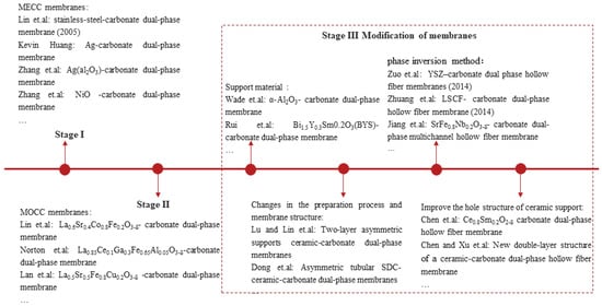 As is the case with the majority of ceramic membranes, carbonate dual-phase membranes are typically subjected to high-temperature operations (>550 °C). The chemical stability of these membranes is compromised by the reaction between the ceramic phase and gas species such as CO2 and H2S, or loss of carbonates from the support pores (e.g., metal–carbonate membranes). However, in recent years, selective and technical methods for enhancing the stability of carbonate dual-phase membranes used in CO2 separation primarily include (1) application of a membrane in a suitable case, (2) support modification, (3) proper ceramic materials selection, and (4) optimal utilization of membranes. The investigations by Norton et al. [55] on LSCF–carbonate membranes (Section 4.1) and a comprehensive study of Ag–carbonate membranes (Section 3.1) serve as exemplary illustrations for enhancing membrane stability through patterns (1) and (2), respectively, as previously mentioned. Next, we will primarily focus on presenting additional cases for investigating and enhancing the stability of the membrane.