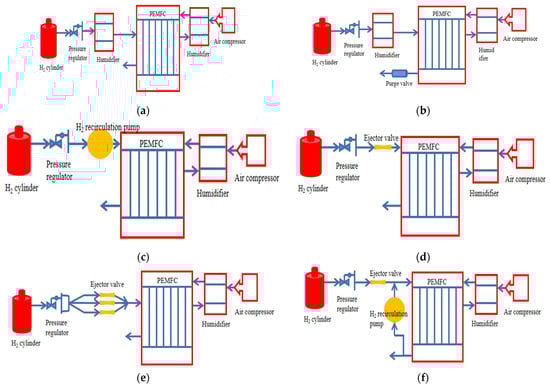 Figure 3b. A purge solenoid valve is installed at the anode outlet to leave part of the hydrogen in the reaction area to enhance the utilization efficiency of the hydrogen. However, over time, the qualitative gas and the liquid water generated by the reaction diffuse to the anode area through the proton exchange membrane and accumulate, blocking the gas channel, resulting in the hydrogen being unable to effectively contact the catalyst, with a consequent battery voltage drop. Subsequently, scholars began to explore hydrogen recycling patterns, aiming to reduce hydrogen consumption, to reduce safety risks, and to extend battery life, as shown in