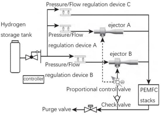57] proposed a fuel cell system using a hydrogen circulating pump and ejector. When the actual hydrogen circulating flow is less than 25% of the rated flow, the hydrogen circulation pump is used, as shown in