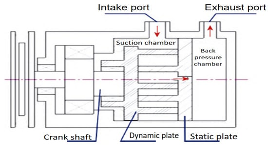Figure 14, mainly comprising a scroll disk (moving disk, static disk), crankshaft, suction port, exhaust port, etc. When working, the gas enters the suction chamber through the suction port and the gas in the suction chamber enters the compression chamber through the suction port of the meshing vortex disc. After the gas is fully compacted, it enters the back pressure chamber at the back of the compressor through the exhaust port of the vortex disk, and then it is discharged through the exhaust port opened on the back pressure chamber [