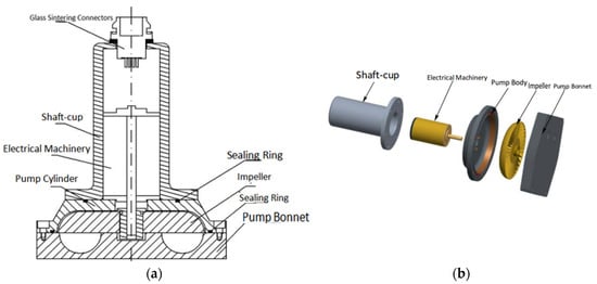 70]. The fluid is driven by two vortex structures with different sizes and angles. With regard to the problems of poor sealing, significant noise, and vibration, the vortex compressor has the unique advantages of high efficiency, low noise, low vibration, reliable operation, and step-less flow adjustment. However, it has problems that are difficult to fix and is unable to rotate in both directions. Furthermore, the flow rate is lower than for pumps of similar sizes due to structural constraints. The structure of a scroll-type hydrogen circulation pump is shown in