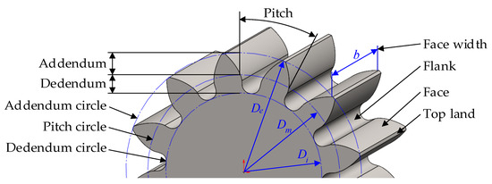 The main elements in external gear pump construction are two identical spur gears, most often having an involute profile. The terminology related to their design parameters, established in the literature [46], is shown in Figure 1.
