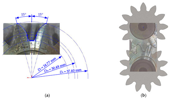 Figure 2. Created tooth profile of the spur gears: (a) imposition of sketches on the captured images; (b) comparison of the resulting tooth profile with high-resolution photographs. - A comparison of the resulting tooth profile with high-resolution photographs at the same scale shows satisfactory results—see Figure 2b.