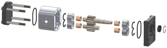 The characteristic features of rotary displacement gear pumps are their relatively simple construction, small overall dimensions, and mass. There are designs with two, three, or more gears that are meshed externally or internally. External gear pumps are more common. They are widely used in hydraulic drives with both industrial and mobile applications [1]. Their construction consists of two identical spur gears that are placed in a common housing and permanently meshed. One of the gears is driving—it is mounted on a shaft (most often a shaft gear), which passes outside the housing. The other gear is driven from the driving gear. The radial and axial clearances between the gears and the housing are very small. The profile of the teeth is most often involute [2].