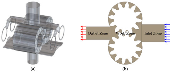 - Suction and delivery ports (Inlet Zone and Outlet Zone in Figure 4b). They do not change their shape and size during operation, which reduces the requirements for the finite elements mesh. It is appropriate to use a structured mesh of rectangular finite elements (quadrilaterals face meshing). This type of mesh gives faster and more stable solutions than other types of meshes, very often and more accurately, due to the even shape of the elements. Larger-size elements can be used without negatively affecting the solution.
