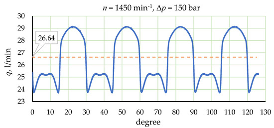 The experiment was performed from minimum (950 min−1) to maximum (1450 min−1) rotation frequency. For each frequency mode, different pressure values are set from minimum (5 bar) to maximum (150 bar), which is maintained constantly by the loading system. The duration of the experiment and the variation of the parameters in the described sequence lead to heating of the working fluid, especially with an increase in the rotation frequency and pressure. In operating modes close to nominal (maximum frequency and high pressure), slight heating of the working fluid occurs, which is not accounted for in the simulation model and leads to the deviation visible in Figure 15 at 1450 min−1. These temperature changes are not evaluated in the CFD model, and they are the cause for deviations in the match between simulation and experimental results (Figure 15).