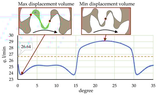 - Discharge channels. They ensure a more even pressure distribution, largely prevent the creation of areas of excessively high or excessively low pressure, reduce the risk of cavitation, and reduce wear. They also increase the displacement volume because they reduce the fluid transfer from the high- to the low-pressure area through the tooth meshing area. The discharge channels’ influence on q(Δp) and q(t) is significant, mainly because of their effect on the pump displacement volume.