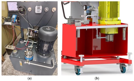 Experimental setup: (a) photograph; (b) hydraulic power unit setup (3D CAD model).