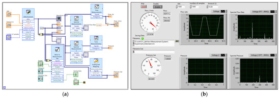 LabVIEW DAQ system-developed software: (a) block scheme; (b) user interface.