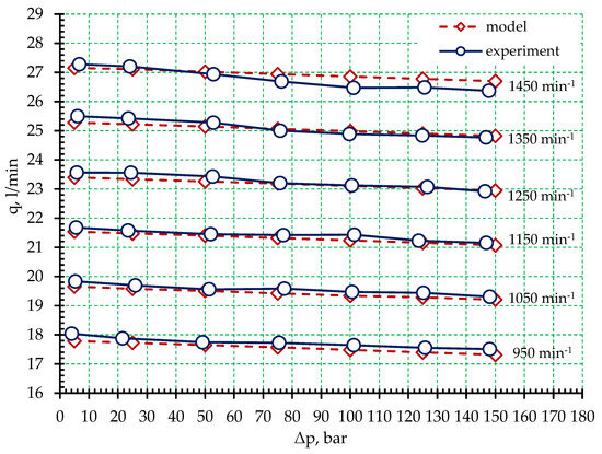 Nevertheless, the equal negative slope of the model and experiment q(Δp) characteristics proves that the geometry of the pump is successfully reproduced, and the construction gaps are correctly specified. On the other hand, Figure 15 shows little or no difference between the model end experiment characteristics at all rotation frequency modes. This proves that the methodology for determining the gears’ face width is successful.