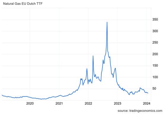 Based on https://tradingeconomics.com/, the price of natural gas listed at the EU Dutch TTF (Title Transfer Facility, the main reference virtual market for gas trading in Europe, based in Amsterdam, the Netherlands) is fluctuating over time. Figure 1 below shows natural gas prices in EUR/MWh.