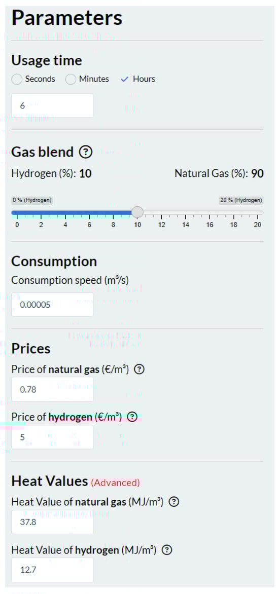 Users are allowed to change several parameters such as: amount of H2 in the gas blend, consumption speed of the gas blend, prices, and heat values. See Figure 2 for user input. Total costs and final results for each input are updated after the button “Calculate” is clicked. The developed calculator is available for public use by accessing: https://bioekonomika.lbtu.lv/H2Calc/ (accessed on 20 January 2024).