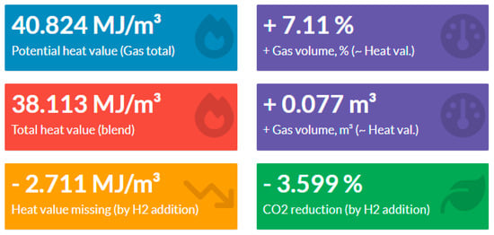 For the presentation and analysis of results, the authors selected t = 21600 s (6 h) and AmountH2 = 10%. For scientific and technical reasons, it is considered possible to introduce up to 20% of hydrogen without any negative impact on end-users, infrastructure, or pipelines. All calculations were performed in MS Excel (version: Microsoft Office Professional Plus 2019) spreadsheet software. Afterwards, to present the calculations and results of the economic evaluation, a single page web application was developed. It was built using R [33], a language and environment for statistical computing. The main R packages that were used for application development were Shiny [34] (WEB application development) and Plotly [35] (graphing library).