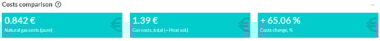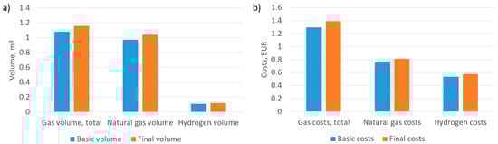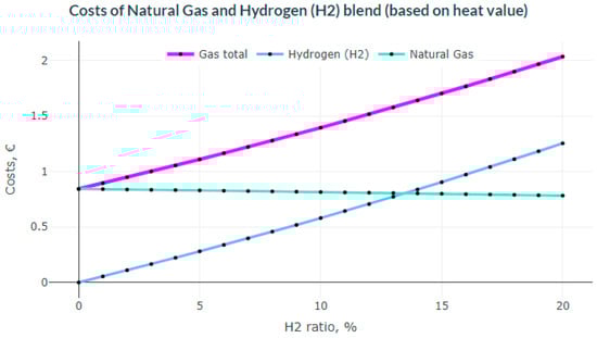 At the end, for the given example, the potential natural gas costs, without blending with hydrogen, are 0.842 EUR. In contrast, with blending with hydrogen, the costs are 65.06% higher, at 1.39 EUR (see Figure 5). Initially, this means that from the consumer point of view, blending hydrogen with natural gas is not economically feasible.