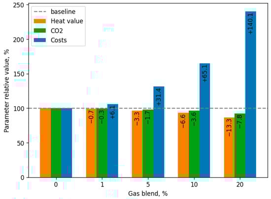 When running the calculations for different amounts of hydrogen in the gas blend, different values are obtained (see Figure 6). As a baseline, a gas blend with 0% hydrogen is considered and taken as a reference point. Then, blends with different amounts of hydrogen are compared (1%, 5%, 10%, and 20%). It can be observed that the decrease of the CO2 is not equal to the decrease in the gas blend heat value. Further, the cost of the gas blend is increasing with the addition of hydrogen to the blend.