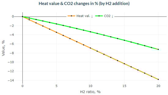 Figure 6 shows the relationship between heat value losses and the decrease in carbon dioxide emissions due to the presence of hydrogen in the gas blend. The loss in heat value with increasing hydrogen concentration in the gas blend can certainly be considered a negative fact from an energy point of view. At the same time, a very positive ecological effect is the reduction in carbon dioxide emissions. In this case, the difference between the ratios of these two indicators directly depends on the heat value of the two gases.