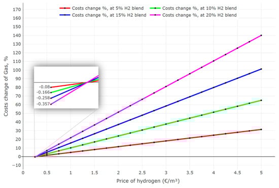 Changes in the cost of the gas blend for different amounts of hydrogen added.