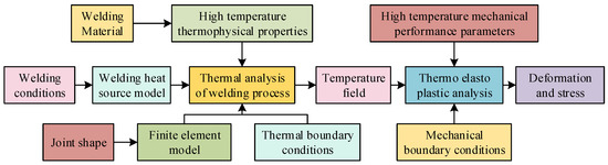 Figure 1 shows that, during the welding process, phenomena such as metal melting and solidification, electromagnetic effects, heat transfer processes, and solid phase transformation occur. In the simulation calculation of welding stress and strain, the main consideration is the interaction between temperature field and deformation, RS, and microstructure. The changes in temperature field and microstructure have a significant impact on the welding stress and strain field. Therefore, in numerical simulation, other factors can be ignored and the effect of temperature field and microstructure on the welding joint stress and strain field are the only things that need to be considered [26]. There are generally three methods for predicting deformation of welded joints: inherent strain method, analytical method, and thermal elastic plastic FE method and, of these, the analytical method is the only one that applies to the deformation prediction of simple welded structures. The inherent strain method only predicts stress and deformation that occur within a small range of welded joints, and so its practical engineering deformation prediction is often limited. With the rapid development of computer technology, the effectiveness of the thermal elastic plastic FE method (developed on the basis of MARC 2022 software) in simulating the RS of welded joints in steel structures has been verified. The use of the thermal elastic plastic FE method to calculate RSis shown in Figure 2.