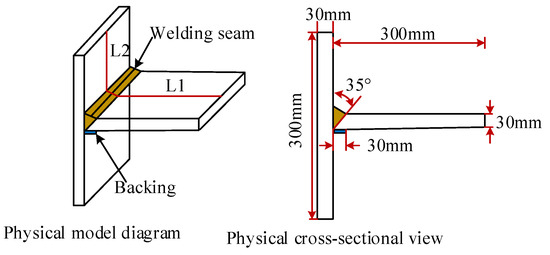 The RS of welded joints in steel structures is calculated by using the thermal elastic plastic FE method. Firstly, a Q390 steel plate with a thickness of 30 mm is numerically simulated. The length and width of the steel flat plate are set to 300 mm, with a V-shaped groove of 35 °C. The max amount of weld passes should not exceed 5, and the temperature of the welding intermediate layer should be controlled within 100 °C. ER50-2 welding wire with a diameter of 1.2 mm should be used without preheating before welding, and gas protection should be used to complete the welding. The experiment uses the blind hole method for RS measurement, and two items of professional equipment: a ROMER INFINITE 2.0 coordinate measuring instrument and a Sigmar-ASM stress measuring instrument. The experimental process is as follows: 1. Clean the surface of the test plate to ensure measurement accuracy. 2. Attach and arrange the strain gauges, which needs to be done carefully to ensure the quality of strain gauge adhesion. 3. Connect the instrument and ensure the connection is correct. 4. Zero calibrate the instrument to eliminate errors. 5. Perform stress measurement by punching holes. 6. After drilling, wait for the reading on the instrument to stabilize, and then print the measured results. 7. Use a marker pen to evenly arrange a series of points on the surface of the test board, which will be used to measure the deformation outside the surface of the test board. 8. Use the ROMER INFINITE 2.0 coordinate measuring instrument to measure the three-axis coordinates of the 50 points that were previously arranged. 9. Use MATLAB 9.11 (R2021b) software to draw three-dimensional deformation graphics of welded joints. The physical simulation and geometric dimensions of the components are shown in Figure 3.