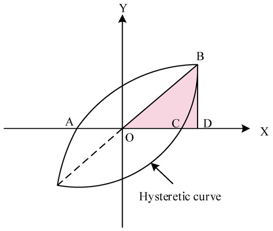 In Figure 8, the equivalent viscous damping coefficient is calculated from the area enclosed by the ABC segment, the horizontal axis of the hysteresis curve, and the area enclosed by the BOD. The calculation method for the equivalent viscous damping coefficient is shown in Equation (16).