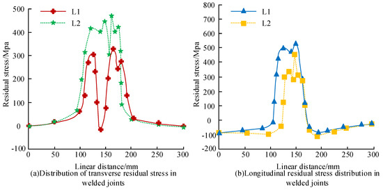 In Figure 9b, the horizontal axis represents the length distance between L1 and L2, while the vertical axis represents the longitudinal RS. The distribution trend and magnitude of the longitudinal RS in L1 and L2 had good consistency. At a length distance of 150 mm, the longitudinal RS peaks obtained in L1 and L2 were 525 MPa and 425 MPa, respectively. The longitudinal RS peak in L2 decreased by 19.05%, compared to L1. Overall, the RS in the vicinity of the weld seam was tensile stress, and the distribution trend of RS in the long and wide directions of the FE model was consistent. The above results confirm the transverse and longitudinal RS distribution of the V-shaped-groove-welded joint structure exhibited a certain regularity. In the lateral direction, the RS distribution trends of L1 and L2 were consistent, both peaking at a length distance of 160 mm. However, the peak RS in L2 decreased by 31.58%, compared to L1, indicating that, in the case of the transverse direction, the RS gradually decreased as the distance from the center of the weld increased. In the longitudinal direction, the RS distribution trend and magnitude of L1 and L2 also showed good consistency, peaking at a length distance of 150 mm. However, the longitudinal RS peak of L2 also decreased by 19.05%, when compared to L1, indicating that, in the longitudinal direction, the RS gradually decreased as the distance from the center of the weld increased. Overall, the RS in the vicinity of the weld seam was tensile stress, and the distribution trend of RS in the length and width directions of the FE model was consistent, which indicated that the RS distribution in the transverse and longitudinal directions of V-groove welded joints was influenced by various factors, such as the welding process, material properties and joint form, etc.