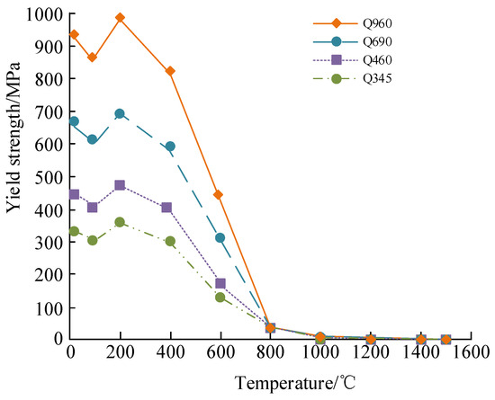 To verify and analyze the impact of RS on seismic performance, butt-welded joints with different steel structure plates were constructed, and four different steel structure plates (Q345, Q460, Q690, and Q960) were subjected to numerical simulation (conducted with ABAQUS FE software) and comparative analysis. The joints were all flat butt joints, and instantaneous heat sources were used during the welding process. The dimensions of the four types of steel structural plates were all , and five weld passes were set. The coefficient of radiation heat dissipation was 0.25, and the coefficient of convective heat dissipation was . The comparison of the yield strength of four different steel structural plates is shown in Figure 10. When the temperature reached 800 °C, the yield strength of all four types of steel structural plates decreased to 50 MPa; when it exceeded 800 °C, the yield strength decreased to 0; and when the temperature reached 200 °C, the maximum yield strength of all four types of steel structural plates was achieved, and the maximum yield strength of the Q345, Q460, Q690, and Q960 steel structural plates was 345 MPa, 460 MPa, 690 MPa, and 960 MPa, respectively. The greater the yield strength, the better the ductility and toughness, and therefore the seismic performance of four different steel structural plates was . Overall, the processing temperature of the four types of steel structural plates could not exceed 800 °C, and Q960 showed the best seismic performance of the four types of steel structural plates. In referring to the above results, we see the yield strength of four different steel structural plates decreased to 50 MPa when the temperature reached 800 °C, meaning that, when at this temperature, the structural strength of these materials was already very low, which could cause structural failure or damage. After exceeding 800 °C, the yield strength further decreased to 0, indicating these materials lose their load-bearing capacity at high temperatures. When the temperature reached 200 °C, all four types of steel structural plates reached their respective peak yield strength. Of them, the maximum yield strengths of Q345, Q460, Q690, and Q960 were 345 MPa, 460 MPa, 690 MPa, and 960 MPa, respectively. Yield strength was the minimum stress value at which a material undergoes plastic deformation, reflecting the material’s ability to resist plastic deformation: the higher the yield strength, the greater the force that the material needs to withstand during plastic deformation, resulting in better ductility and toughness. In referring to the obtained data, we draw the following conclusions: first, the processing temperature of the four different steel structural plates cannot exceed 800 °C, as this will lead to a significant decrease in material strength and affect structural safety. Second, at this temperature, Q960 has the highest yield strength of up to 960 MPa, indicating it is most strongly resistant during plastic deformation, and therefore has the best seismic performance.