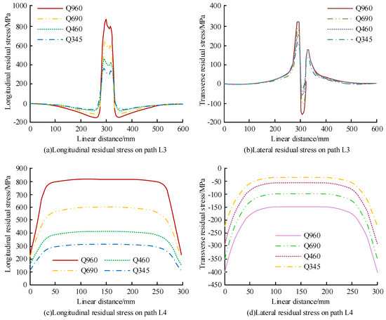 As shown in Figure 3, L1 and L2 represent the RS distribution along the horizontal and vertical directions of the welded web, respectively. To verify the RS distribution of four different steel structural plates, the distance perpendicular to the central section of the weld seam in the flat-butt-joint-weld structure was set to L3, and the center-line path of the weld seam was set to L4. The RS distribution curves on paths L3 and L4 are shown in Figure 11. In Figure 11a, the longitudinal RS distribution trends of the four types of steel structural plates are very similar, and only the peaks differ. When the distance of L3 was 300 mm, the longitudinal RS peaks obtained for Q345, Q460, Q690, and Q960 were 350 MPa, 475 MPa, 650 MPa, and 875 MPa, respectively. In Figure 11b, the L3 distance of the four types of steel structural plates obtain transverse RS peaks and valleys at both ends near to the center-line of the weld. The transverse RS peaks obtained for Q345, Q460, Q690, and Q960 were 225 MPa, 250 MPa, 275 MPa, and 325 MPa, respectively. The transverse RS valleys obtained for Q345, Q460, Q690, and Q960 were −25 MPa, −50 MPa, −100 MPa, and −150 MPa, respectively. In Figure 11c, the RS of Q960 is significantly greater than other steel structural plates. When the distance of L4 was between 0 to 30 mm, the longitudinal RS of the four steel structural plates increased as the distance increased. When the distance was from 30 mm to 270 mm, the longitudinal RS of the four steel structural plates remained unchanged. When the distance of L4 was from 270 mm to 300 mm, the longitudinal RS of the four steel structural plates decreased when the distance increased. In Figure 11d, the distribution trend of lateral RS in L4 is consistent with the trend of longitudinal RS. Overall, when the yield strength was greater, so was the value of RS generated by welding steel structural plates.