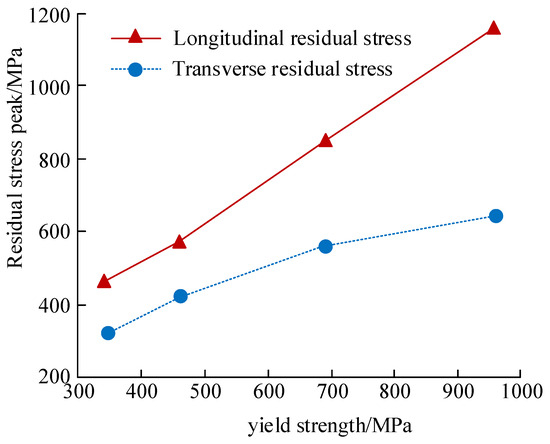 In order to observe the relationship between RS and the yield strength of four types of steel structural plates more clearly, the relationship was plotted, as shown in Figure 12, which shows the overall RS increased linearly with the increase of yield strength. At the same yield strength, the value of longitudinal RS was significantly greater than transverse RS. When the yield strength was 345 MPa, the value of longitudinal RS increased by 27.78%, compared to transverse RS. When the yield strength was 960 MPa, the value of longitudinal RS increased by 88%, compared to transverse RS. These results demonstrated a linear relationship between RS and yield strength that indicated that when the yield strength increased, the overall RS also increased accordingly. This may be because materials with high yield strength are often stiffer and stronger, resulting in greater RS during the welding process. In addition, the difference between longitudinal RS and transverse RS shows that, when yield strength was the same, the value of longitudinal RS was significantly greater than transverse RS, which could be attributed to the shrinkage and thermal expansion characteristics of the material during the welding process, as well as the geometric shape and constraint conditions of the welded joint. The effect of solid-state phase transition on longitudinal RS was more significant, and its effect on transverse RS was relatively small, indicating that solid-state phase transition mainly affected the material’s longitudinal properties. As the yield strength increased, the effect of solid-state phase transformation on longitudinal RS also increased accordingly.