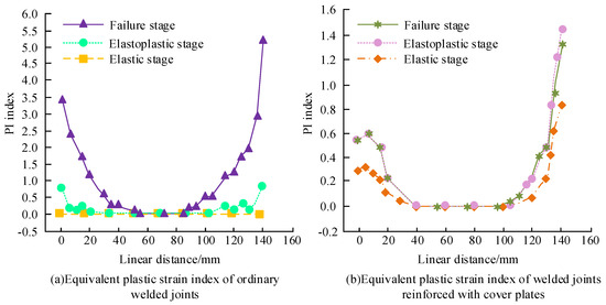 In order to verify the fracture performance of each node of the welded joint, numerical simulation was conducted on the ordinary welded joint and the cover plate reinforced welded joint, before the equivalent plastic strain index of each node at different stages was plotted, as shown in Figure 13. In Figure 13a, when the ordinary welded joint was at the elastic stage, the equivalent plastic strain index of each node was 0. When the ordinary welded joint was at the elastic-plastic stage, the equivalent plastic strain index of each node showed a trend of being large at both ends and stable in the middle. At this time, the equivalent plastic strain index was 0.60 and 0.63 when the distance between the two ends was 0 mm and 140 mm, respectively. When the ordinary welded joint was at the failure stage, the equivalent plastic strain index of each node showed a significant growth trend at both ends; at this time, the equivalent plastic strain index was 3.50 and 5.25 at distances of 0 mm and 140 mm, respectively. In Figure 13b, when the reinforced welded joint of the cover plate was at the elastic stage, the equivalent plastic strain indices were, at distances of 0 mm and 140 mm, 0.28 and 0.81, respectively. The trend of the elastic-plastic and the trend of the failure stages of the welded joint reinforced by the cover plate were almost the same. The equivalent plastic strain indices of both stages at a distance of 0 mm were 0.53, while the equivalent plastic strain indices of the elastic-plastic and failure stages at 140 mm were 1.46 and 1.34, respectively. Overall, the probability that each node of ordinary welded joints would fracture during the failure stage was relatively high.