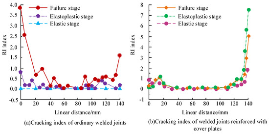 In order to comprehensively verify the fracture performance of each node of the welded joint, a comparative analysis was conducted of the cracking index of ordinary welded joints and cover plate-reinforced welded joints. The cracking index of each node at different stages is shown in Figure 14. In Figure 14a, the cracking index of ordinary welded joint nodes in the elastic stage is 0. When the distance was 0 mm, the maximum cracking index in the elastic-plastic stage and the failure stage was 0.78 and 3.82, respectively. In Figure 14b, the cracking index trend of each node in the reinforced welded joint of the cover plate is consistent in the three stages. When the distance was 140 mm, the cracking index in the elastic stage, elastic-plastic stage, and failure stage were 1.83, 7.52, and 5.04, respectively. Overall, there was a high possibility that each node of the reinforced welded joint of the cover plate would crack during the elastic-plastic stage.