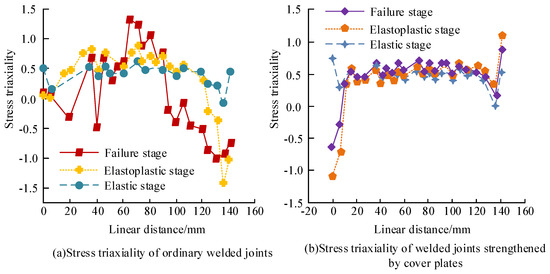 In order to verify the possibility of brittle fracture in welded joint nodes, a comparative analysis was conducted, which considered the stress triaxiality of ordinary welded joints and cover plate-reinforced welded joint nodes, as shown in Figure 15. In Figure 15a, the stress triaxiality of ordinary welded joints in the elastic stage fluctuated within the range of 0.5, and the overall distribution was relatively stable. At a distance of nearly 140 mm in the elastic-plastic stage, a peak value of −1.5 appeared, indicating a higher possibility of brittle fracture at this time. At a distance of 70 mm during the failure stage, a peak of 1.5 appeared, indicating that the middle part of the ordinary welded joint weld was prone to brittle fracture during the failure stage. In Figure 15b, the trends in the three stages of strengthening the welded joint of the cover plate are similar. The stress triaxiality of the three nodes at the middle distance was stable at around 0.5, and a peak stress triaxiality was generated at both ends of the distance. When the distance was 0 mm, the stress triaxiality peaks at the elastic stage, elastic-plastic stage, and failure stage were 0.75, −1.15, and −0.62, respectively. When the distance was 140, they were 0.55, 1.12, and 0.87, respectively. Overall, there was a high possibility that brittle fracture would occur in the middle of ordinary welded joints during the failure stage. In the elastic stage, the stress triaxiality of both types of welded joint nodes was around 0.5, and the overall distribution was relatively stable, showing a three-dimensional tensile state, in which (not severe) fracture was possible. When entering the elastic-plastic and failure stages, the web welds of ordinary welded joint nodes were compressed at both ends and there was tension in the middle. The peak value in the middle of ordinary welded joint nodes was close to 1.5, indicating a high possibility of brittle fracture in this area. However, the equivalent plastic strain index and cracking index were generally of a lower level. Comparison of the stress triaxial analysis of two types of nodes showed the possibility of fracture in the beam-web-weld seam of ordinary nodes was relatively small in the three stages, and the two ends were in a state of three-dimensional compression state at the elastic-plastic and failure stages, when ductile cracking was highly likely to occur.