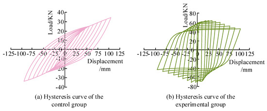 In order to verify the calculation results obtained through FE analysis in this study, FE software was used for simulation and to construct the hysteresis curve of BSS, before a series of control experiments were conducted. In these experiments, two groups were set up: group one, the control group, an unwelded reinforced building steel structure; the second group, the experimental group, was a building steel structure reinforced with welding treatment through cover plates. The hysteresis curves of the experimental group and the control group obtained through simulation are shown in Figure 16. In Figure 16a, the hysteresis curve of the control group shows a typical anti-S shape, which indicates that, after repeated loading, both energy dissipation capacity and seismic resistance were limited. In contrast, the hysteresis curve of the experimental group in Figure 16b resembles a substantial shuttle shape, which attests to better energy dissipation and seismic performance, and indicates the seismic performance of the reinforced welded building steel structure showed a significant improvement, which is consistent with previous calculation results obtained through the FE method by this study, and further verifies the accuracy of the calculation result. The FE analysis method used in this study and the conclusions it provided were reliable, and will be an important point of reference that will add considerable value to efforts to guide the actual seismic reinforcement design of BSS.
