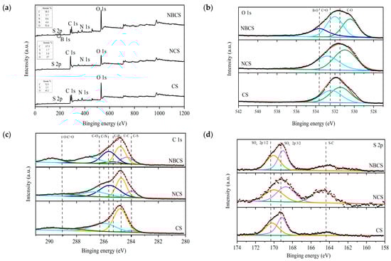 (a) XPS of NBCS, NCS, and CS; (b) O 1s of NBCS, NCS, and CS; (c) C 1s of NBCS, NCS, and CS; (d) S 2p of NBCS, NCS, and CS; (e) N 1s of NBCS and NCS; (f) B 1s of NBCS. The solid line in red is the sum of all the peak fittings while the curves in other colors represent elements with different valence state.