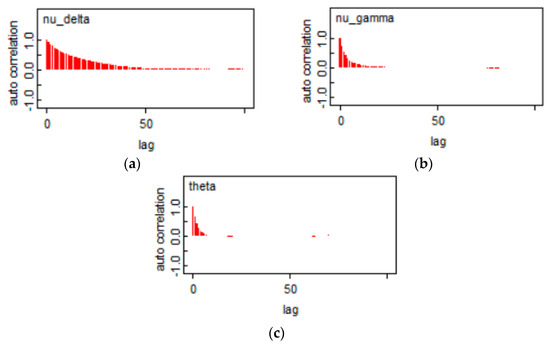 The autocorrelation functions of parameters. (a) The autocorrelation functions of . (b) The autocorrelation functions of . (c) The autocorrelation functions of .