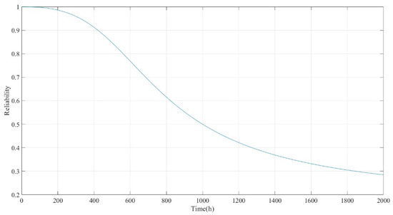 Based on the parameter estimation results shown in Table 1, the reliability assessment results of the spindle system, as illustrated in Figure 2, can be acquired using Equation (31).