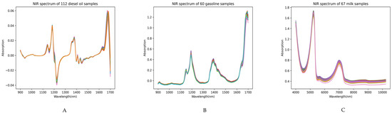 In this study, a 1D-CNN model is constructed using raw NIRS data. The dataset included 60 gasoline, 112 diesel, and 67 milk samples. These samples were divided into training and prediction sets in a 7:3 ratio. Specifically, for gasoline and diesel samples of varying concentrations, 70% were randomly selected for training the 1D-CNN model, whereas the remaining 30% were utilized for external prediction to evaluate the performance of the developed 1D-CNN model.