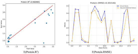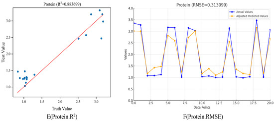 2 value of 0.875788, suggests a strong positive correlation between the true and predicted values, with a closely adhering line of best fit. In panel 6D, the line graph compares the actual and adjusted predicted values with an RMSE of 0.512449, which is lower than that of CN-16, indicating a higher prediction accuracy for octane. Lastly, panels 6E-F represent the analyte protein. The scatter plot in panel 6E, with an R