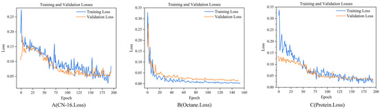 Figure 8B, this plateau phase appeared earlier, with the loss becoming extremely low and stable after approximately 20 epochs. These indicate that the model quickly captured the key features of the data for the gasoline dataset, whereas, for the other two datasets, more training time might be required to achieve similar levels of performance.