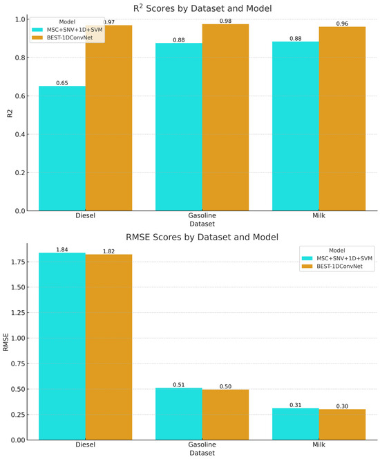 The R2 scores, which indicate the explanatory power of the models, were higher for the BEST-1DConvNet model across all datasets, signifying a stronger correlation between the predicted and actual values. For diesel, the R2 score was 0.969 for BEST-1DConvNet and 0.651 for MSC + SNV + 1D + SVM. For the gasoline dataset, BEST-1DConvNet achieved an R2 of 0.975, whereas the combined preprocessing SVM approach achieved a value of 0.876. The milk dataset results exhibited a similar trend to that of BEST-1DConvNet at 0.961 R2, outperforming the SVM combination by 0.884.