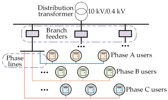 The typical topology of an LVDN is illustrated in Figure 1. It consists of a radial structure formed by distribution transformers, lines, and multiple load points. The branch feeders (primary branch lines) are mostly laid in a three-phase four-wire system, delivering electrical energy to the users of each phase through low-voltage meter boxes. Considering the uniqueness of the connection relationship between the users and the phases of the branch feeders (referred to as “phase lines”), this paper describes the process of identifying the affiliation relationship between phase lines and users as LHRI.
