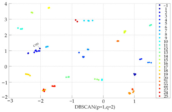 After measuring the similarity of user voltage time-series curves using DTW distance, it is difficult to set an appropriate threshold to judge whether vacant users and regular users belong to the same phase line. The DBSCAN algorithm [16] has the advantage of not requiring the manual setting of the number of clusters and can automatically determine the number of clusters based on the spatial density of samples, making it suitable for datasets of any shape. Therefore, this section uses the DBSCAN algorithm to cluster substation users based on the DTW distance between user voltage sequences, topologically associating vacant users with regular users on the same phase line, and laying the groundwork for further refinement in identifying line–household relationships.