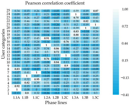 Based on the user clustering results presented in Table 1, the electricity data for the 25 categories and 9 phase lines are subjected to matrix processing. Then, following the electricity significance analysis method proposed in Section 2.4, salient feature points with significant changes in electricity consumption are extracted to form characteristic vectors. Next, the Pearson correlation coefficients between the characteristic vectors of user categories and phase lines are calculated, with the results as depicted in Figure 3, to obtain the relationships between the categories and phase lines.