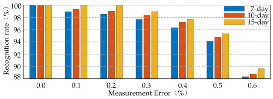 The analysis of measurement data focuses on the tolerance of uncertainty and errors. To study the impact of measurement errors and data length on the identification results, tests are conducted on 7-day, 10-day, and 15-day measurement data with added Gaussian noise. The Gaussian noise has a mean of zero and variable standard deviations. Each error distribution scenario is set to 100 iterations. For each scenario, the accuracy rates are averaged, and this average value is then used as the identification accuracy of the proposed method under that particular Gaussian error. The identification results are depicted in Figure 4.