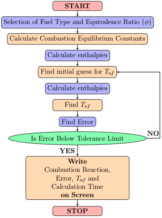 Figure 1 illustrates the flow diagram of the AFT calculation. Once the fuel type and equivalence ratio are selected, the program proceeds to calculate the combustion equilibrium constants and calculate enthalpy values [27,34]. Subsequently, the initial guess for the AFT is obtained, followed by another enthalpy calculation retrieval and the actual AFT calculation. If the calculated error falls below the tolerance limit (), the program terminates the loop and displays the results on the screen.