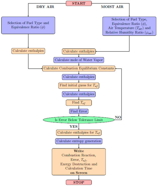 The flow diagram depicted in Figure 2 provides a visual representation of the steps involved in calculating the AFT and conducting exergy analysis for dry and moist air. The AFT calculation procedure remains unchanged from the first flow diagram. However, when dealing with moist air, the temperature of the air () and the relative humidity ratio of the air () are selected as initial parameters. Tables are then consulted to determine the moles of water vapor. Following the AFT calculation, the program proceeds to compute the entropy generation and exergy destruction and ultimately displays the results on the screen.
